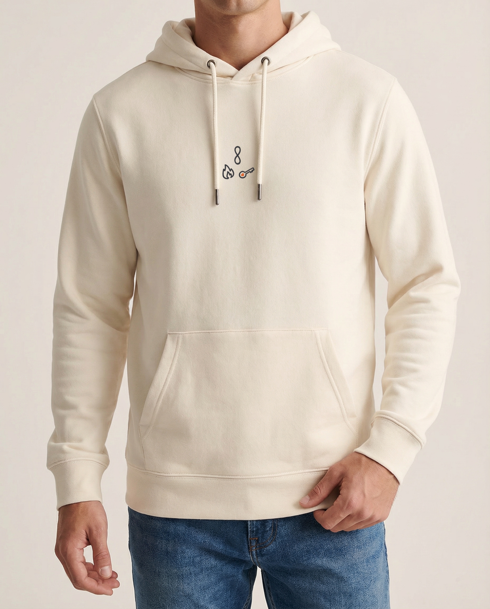 85% coton biologique / 15% polyester recyclé post-consumer. Coton peigné ringspun. Coupe droite. Lavé aux enzymes. Molleton gratté 3 fils LSF (Low Shrinkage Fleece : molleton pré-rétréci). 1/2 lune au dos. Poche kangourou. Bord cote 1 x 1 bas de vêtement et bas de manches. Double surpiqûre bas de manches, emmanchures, bas de vêtement et 1/2 lune. Bande de propreté intérieur encolure dos. Capuche doublée en matière principale avec point d’arrêt cordon. Cordon rond avec embouts et oeillets en métal recyclé. La couleur Raw Natural se distingue par son aspect brut visuellement texturé, parsemée de fines particules visibles à l’œil nu.