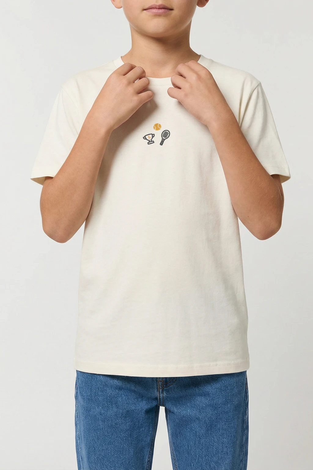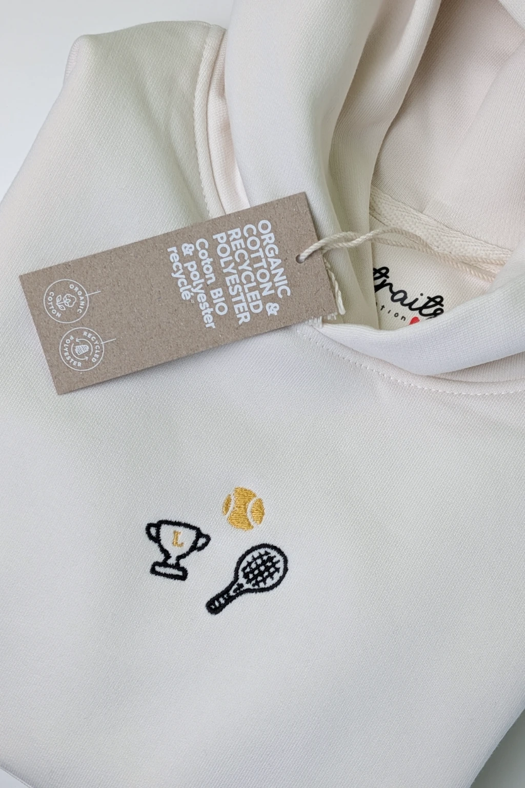 Le trio pour soulever la coupe (même sans avoir joué le match). Une raquette vintage, une balle prête à bondir et un trophée doré qui porte votre initiale. Brodé avec précision en Belgique sur un coton bio d’une douceur absolue.